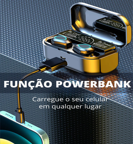 Possui Design moderno com tela digital com informações sobre o fone e carregamento da bateria.